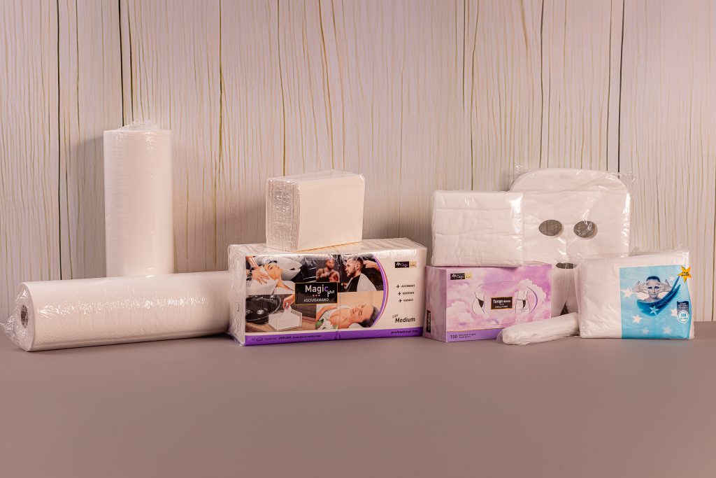 Monouso professionali per epilazione e trattamenti estetici, tra cui lenzuolini in carta, veline struccanti, asciugamani, teli in cartene per fanghi, sacchetti podologici, spatole in legno, strisce depilatorie, guanti, tanga, cuffie, fascette e accessori per garantire igiene, sicurezza e praticità in cabina