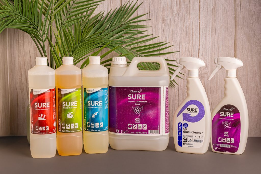 Sure è una linea professionale di detergenti e disinfettanti per la pulizia, a base di materie prime di origine vegetale biodegradabili al 100% e confezionata in contenitori di plastica 100% riciclati. La sua formulazione a base di scarti e sottoprodotti dell’industria agroalimentare, è priva di coloranti artificiali, profumi, quaternari, cloro, fosfati o composti ossidati e si posiziona quindi nelle più basse classificazioni di rischio. La gamma comprende detergenti e brillantanti per lavastoviglie, detergenti manuali stoviglie, detergenti e disinfettanti per pavimenti e superfici, anticalcari per bagno, sapone mani e tanto altro ancora